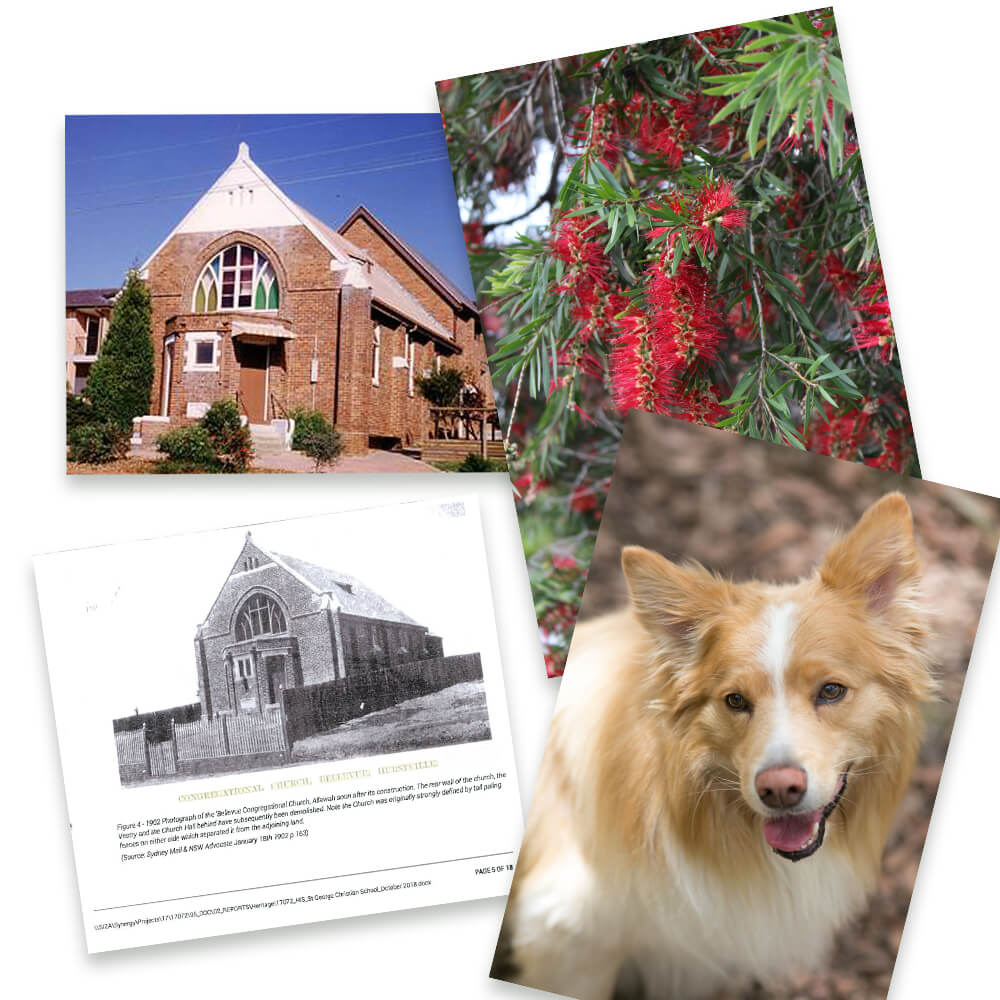 In this example you can see an additional postcard product created for this project of Monroe the dog sitting outside the Chapel which is part of the original illustration.