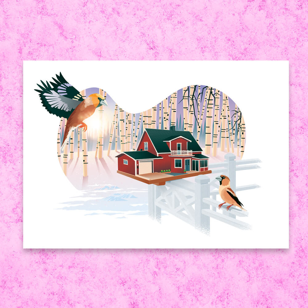 Custom illustration of a residential house in Sweden, used for Christmas and greeting cards.